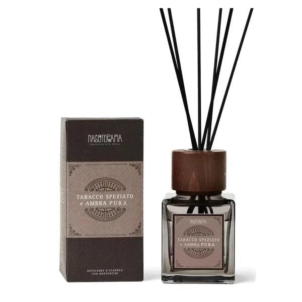 Il diffusore Tabacco Speziato e Ambra è un viaggio olfattivo tra spezie esotiche, legni nobili e resine preziose. La Cannella di Ceylon e i Chiodi di Garofano aprono la fragranza con un tocco speziato e caldo. Il cuore combina le note fumose del tabacco con accenti di cuoio e legni. Il fondo, dolce e avvolgente, unisce vaniglia, ambra grigia e benzoino.